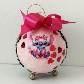 Rękodzielnicza bombka decoupage Lilo & Stitch z Andzią. Dwustronna, z brokatowym tłem, złotym reliefem i czerwonymi sercami.