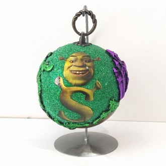 Na froncie bombki widnieje głowa Shreka oraz pierwsza litera jego imienia, nadając całości charakteru i bajkowego klimatu. Z boku ukazuje się zamek, w którym uwięziona została księżniczka Fiona – misternie wykonany z reliefu i ozdobiony połyskującymi płatkami w odcieniach szlachetnego fioletu.