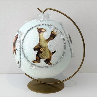 Rękodzielnicza bombka decoupage z bohaterami Epoki Lodowcowej. Cieniowana powierzchnia z efektem lodu, kryształki, brokat i imitacje lodu.