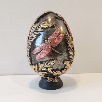 Cena 91,00 złAkrylowe lustrzane jajo, z reliefami z płatkami złota. Jajo pokryte jest od środka odczynnikami dającymi postarzone lustro. Elementem ozdobnym produktu są ważki, które zostały udekorowane mieniącymi się, wielokolorowymi płatkami.