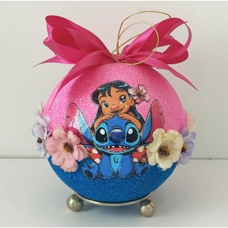 W górnej części bombki króluje subtelny róż, a w dolnej – głęboki odcień niebieskiego. Oba kolory zostały podkreślone dopasowanymi brokatami, które pięknie odbijają światło i nadają całości wyjątkowego blasku.