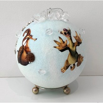Rękodzielnicza bombka decoupage z motywem Epoki Lodowcowej. Postacie Sid, Scratte, Zdzich i Edek, imitacje lodu i brokatowe wykończenie.
