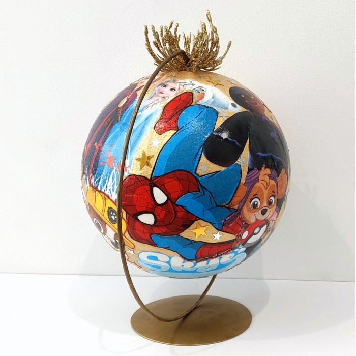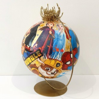 Rękodzielnicza bombka decoupage ze złotym tłem i mini stroikiem. Ozdobiona postaciami z bajek: Kraina Lodu, Psi Patrol, Minionki, Smerfy, Shrek, Spider-Man i inne. Idealna na prezent i choinkę.