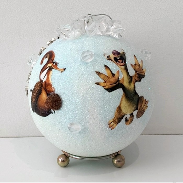 Na powierzchni bombki znajdują się ulubieni bohaterowie bajki: Sid, Scratte oraz oposy Zdzich i Edek, którzy nadają całości humorystycznego i nostalgicznego charakteru. Dodatkowym detalem są imitacje lodu i drobne kawałki szyszek, które wprowadzają naturalny, zimowy akcent i podkreślają rękodzielniczy kunszt wykonania.