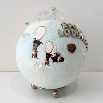 Bombka została wykonana na bazie styropianowej kuli, idealna do zawieszenia na choinkę. Sprzedawana bez stojaka.