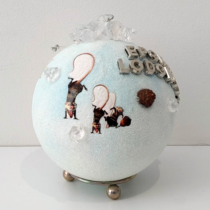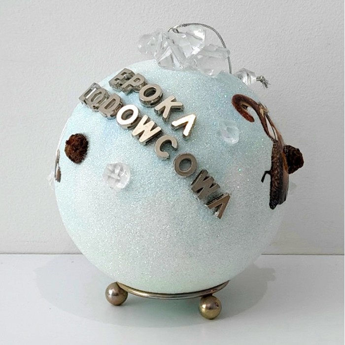 Z tyłu bombki widnieje elegancki, srebrny napis „Epoka Lodowcowa”, a całość została pokryta transparentnym brokatem, który subtelnie mieni się w świetle, nadając dekoracji luksusowego blasku.