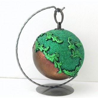 Pozostałą część bombki zdobią metaliczne zielone reliefy, które nawiązują do barw baśniowego bagna, a dolna część kompozycji lśni platkami w głębokim, ceglastym kolorze. Całość dopełnia górna część obsypana zielonym brokatem, który subtelnie odbija światło, tworząc efekt magii i wyjątkowej głębi.