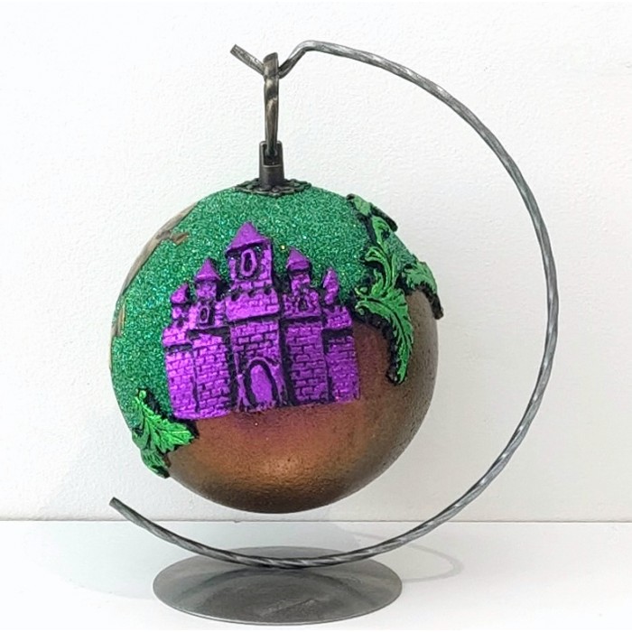 Rękodzielnicza bombka decoupage Shrek. Głowa Shreka, zamek z księżniczką Fioną, reliefy pokryte fioletowymi, zielonymi i ceglastymi płatkami, brokatowe wykończenia. Unikalna ozdoba handmade.