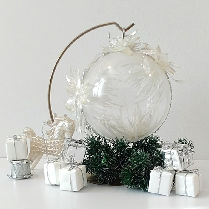 Wokół bombki rozpościera się delikatny szron, podkreślony przez srebrne dekoracyjne taśmy, które dodają jej biżuteryjnego blasku. Wnętrze zdobią białe elementy imitujące zimowy mróz, tworząc efekt lekkości i subtelnego, świątecznego chłodu.