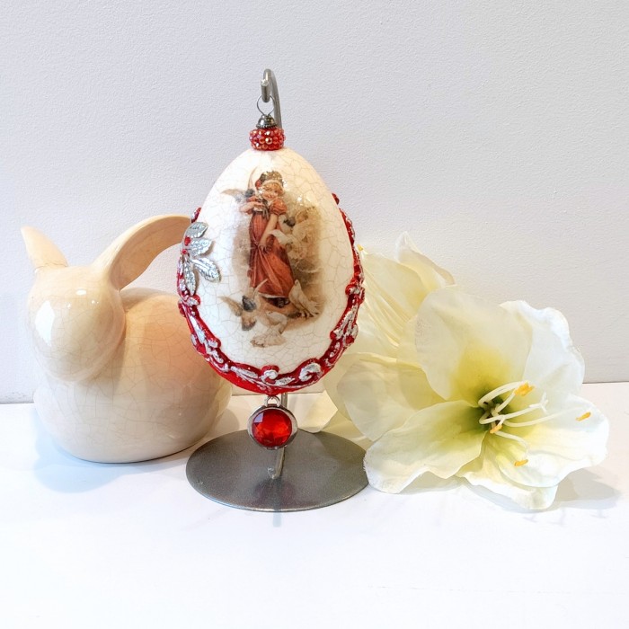 Jajo wykonane techniką decoupage. Górna część  jajka na, której znajduje się wielkanocny motyw został pokryty preparatem, dzięki któremu uzyskano efekt popękanej porcelany. Dolna część jajka została pokryta czerwonym welurem. Natomiast relief, który oddziela obie części jaja został pokryty płatkami srebra. Jajo zostało bogato wykończone biżuteryjnymi dodatkami, zakończeniami i czerwonym biżuteryjnym kryształkiem.