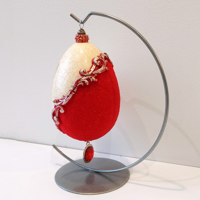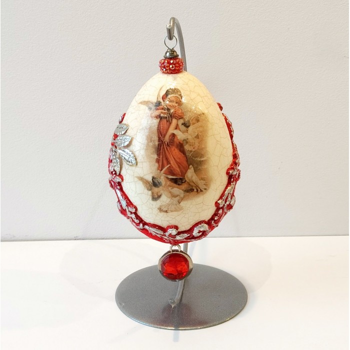 Jajo wykonane techniką decoupage. Górna część  jajka na, której znajduje się wielkanocny motyw został pokryty preparatem, dzięki któremu uzyskano efekt popękanej porcelany. Dolna część jajka została pokryta czerwonym welurem. Natomiast relief, który oddziela obie części jaja został pokryty płatkami srebra. Jajo zostało bogato wykończone biżuteryjnymi dodatkami, zakończeniami i czerwonym biżuteryjnym kryształkiem.
