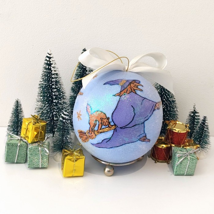 Bombka z motywem Baby Jagi i kota na miotle to doskonały prezent dla osób ceniących niebanalne rozwiązania i artystyczne rękodzieło. Wprowadza do świątecznego wnętrza bajkową aurę i nutę tajemniczości. Bazą