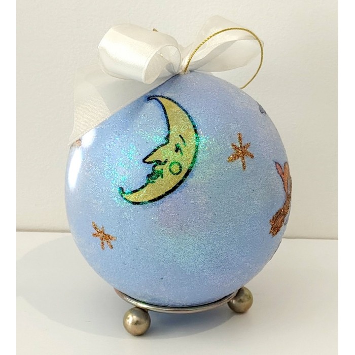 Tło bombki zostało starannie wykonane w formie gradientu, co nadaje dekoracji głębi i płynnego przejścia kolorów. Całość pokrywa brokatowy lakier, dzięki któremu bombka mieni się zjawiskowo i pięknie odbija światło lampek choinkowych.
