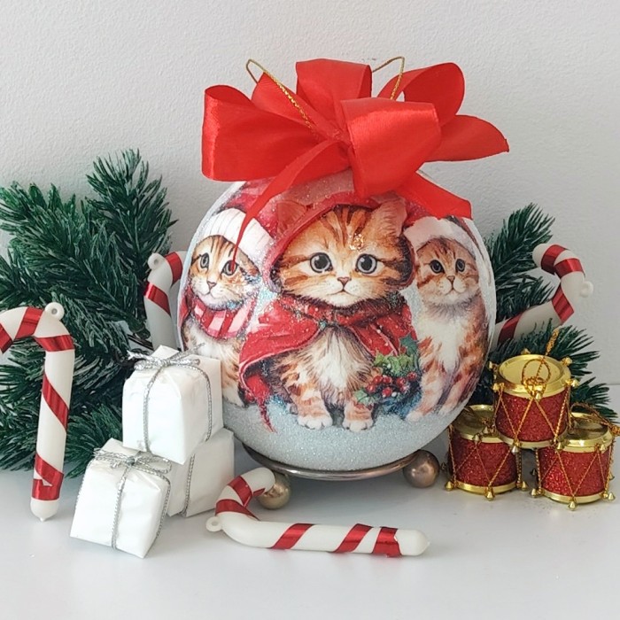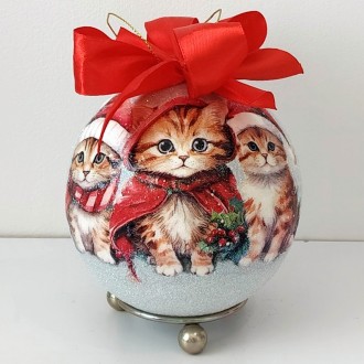 Na górze bombki znajduje się czerwona, elegancka kokarda, dodająca całości klasycznego, świątecznego charakteru. To idealne połączenie ponadczasowego designu i rękodzielniczej sztuki, które sprawdzi się zarówno jako dekoracja choinki, jak i wyjątkowy prezent dla miłośników zwierząt.