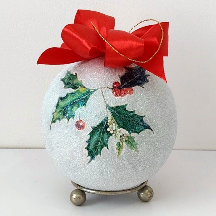 Delikatne, lekko szare tło zostało pokryte transparentnym, mieniącym się brokatem, dzięki czemu bombka pięknie odbija światło i nabiera wyjątkowego blasku. Całość została zabezpieczona brokatowym lakierem, który nadaje jej luksusowego wykończenia i zapewnia trwałość na lata.