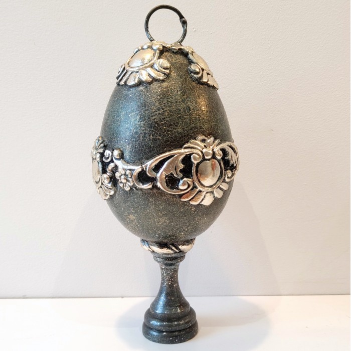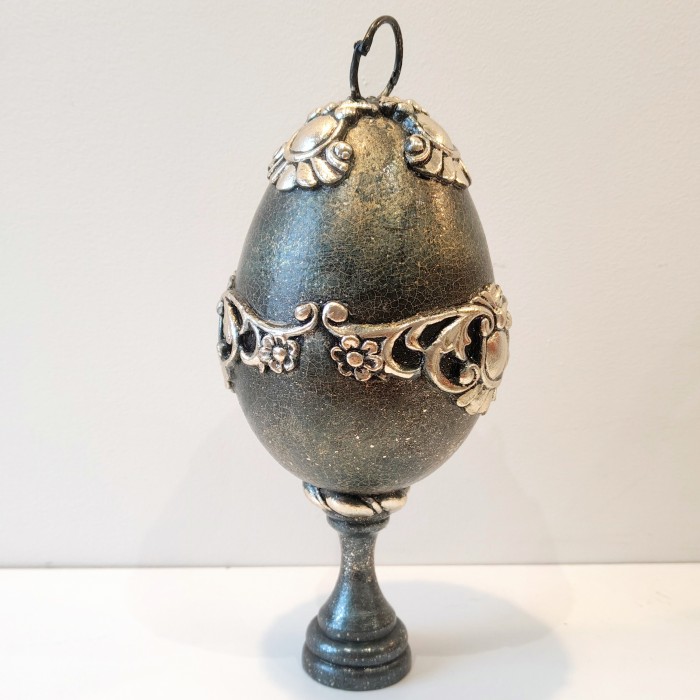 Powierzchnia jajka posiada spękania (efekt crackle), które nadają mu wygląd starej, szlachetnej, lekko nadgryzionej czasem porcelany. To kontrolowany proces twórczy, dzięki któremu każdy egzemplarz zyskuje indywidualny rysunek pęknięć. Reliefy znajdujące się na jajku zostały ręcznie pokryte płatkami srebra, które subtelnie odbijają światło i nadają kompozycji eleganckiego, wyrafinowanego charakteru. Jajko zostało na stałe przymocowane do dekoracyjnej nogi (stopy), dzięki czemu prezentuje się jak mała rzeźba. Nie potrzebuje dodatkowej podstawki – jest gotowe, by stać się centralnym punktem komody, konsoli czy witryny.