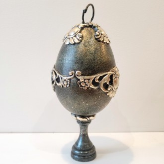 Jajko zostało na stałe przymocowane do dekoracyjnej nogi (stopy), dzięki czemu prezentuje się jak mała rzeźba. Nie potrzebuje dodatkowej podstawki – jest gotowe, by stać się centralnym punktem komody, konsoli czy witryny.