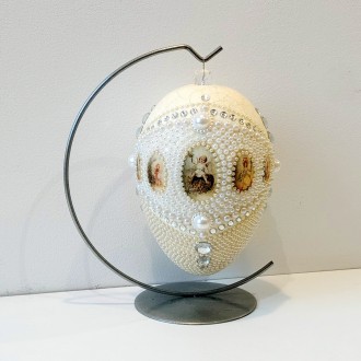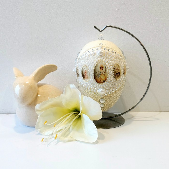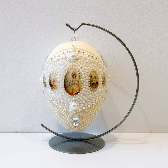 Jajko zostało ozdobione ręcznie naklejanymi półperełkami w kremowym odcieniu. Każda aplikowana osobno, z precyzją i cierpliwością. To detal, który buduje charakter i podkreśla rzemieślniczy kunszt.