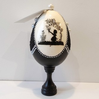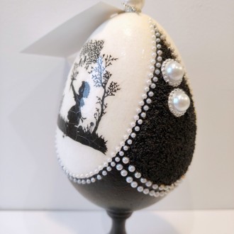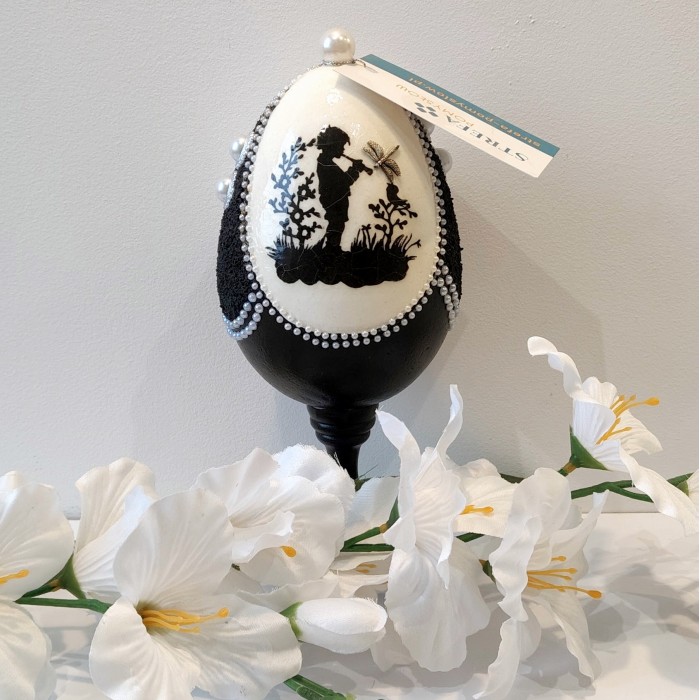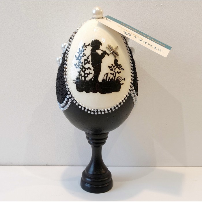 Po obu stronach jaja znajdują się motywy ze spękaniami (efekt crackle), które powstały w wyniku użycia specjalistycznych preparatów. Struktura przypomina starą, szlachetną porcelanę – jakby przedmiot miał swoją historię, choć właśnie powstał.